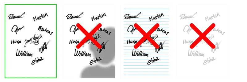 Signaturerna skall skrivas på ett vitt papper med svart tusch för att bli godkända, se bild.