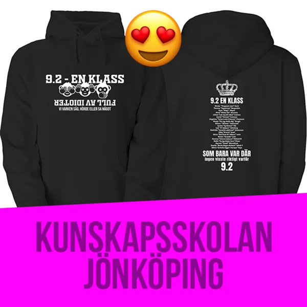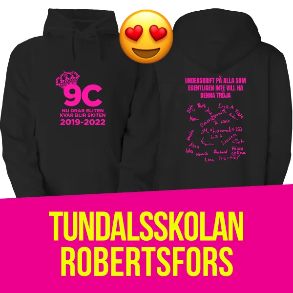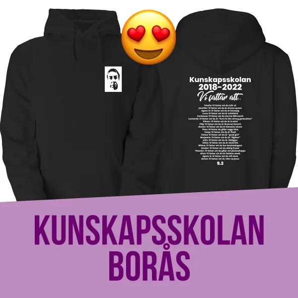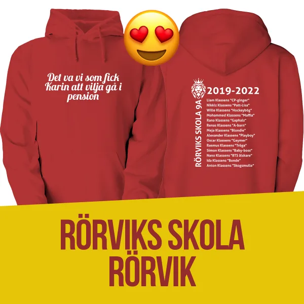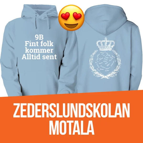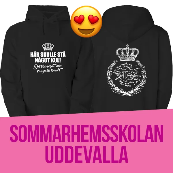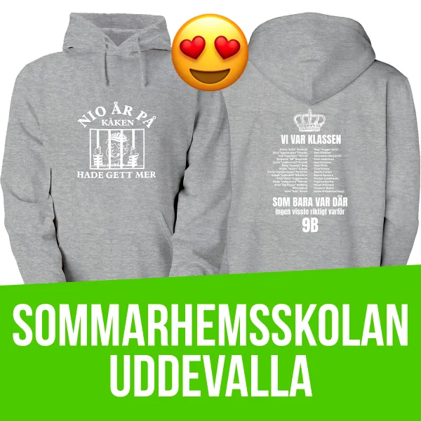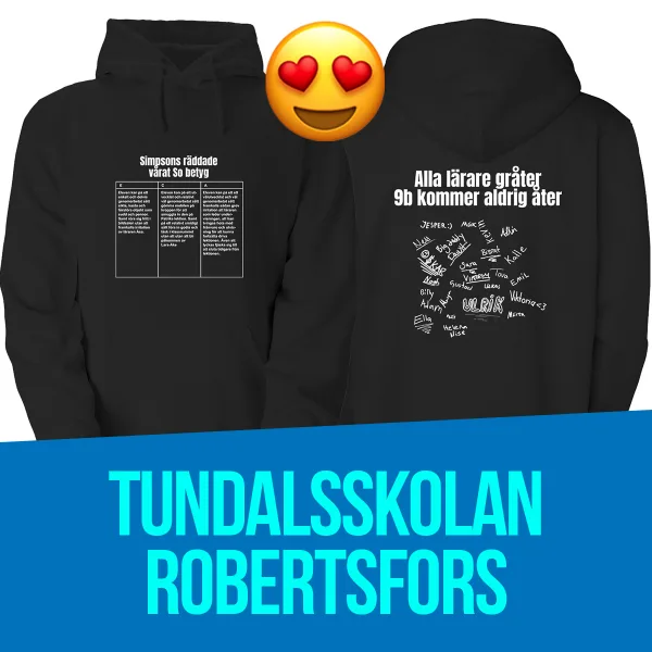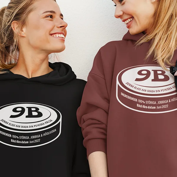 Snart dags för skolavslutning? Ja då är det på tiden att beställa en gemensam klasströja. Hos oss och våra konkurrenter, exempelvis Studenterna finner du billiga klasströjor till bra kvalité. Du kan välja bland ett stort urval av tryck och färger till din hoodie eller collegetröja, allt för du ska kunna designa din helt unika klasströja! Vill ni ha ett helt eget tryck? Inga problem, ladda bara upp ert tryck under beställningsprocessen så fixar vi det utan extra kostnad! Kontakta oss om där är något ni undrar.