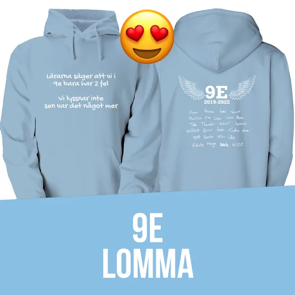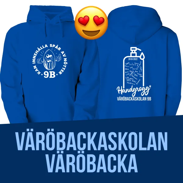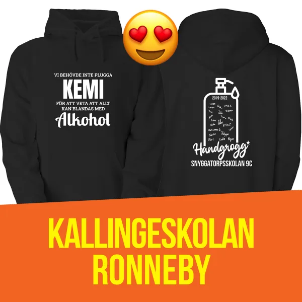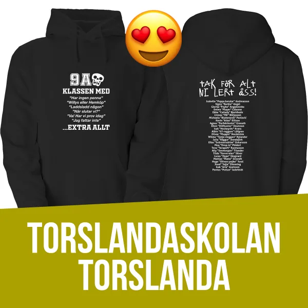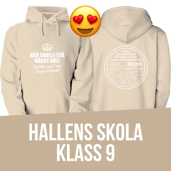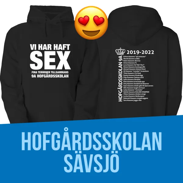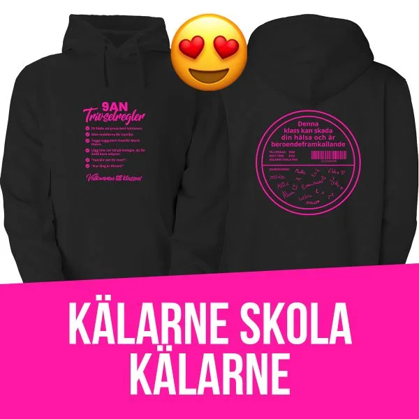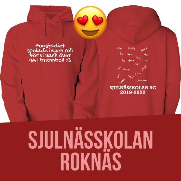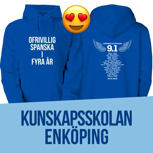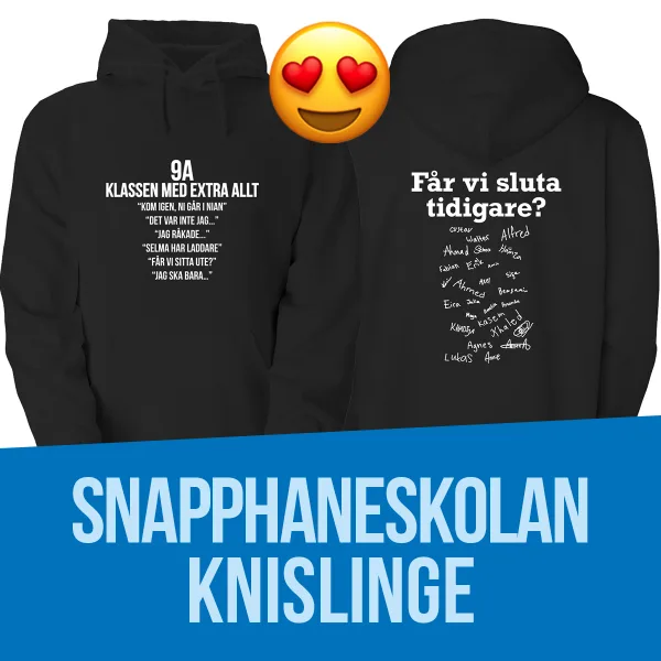 Gamletullsgatan 12, HalmstadÅrets trend på klasströjor är personliga citat med unika texter, tätt följt av att ha sitt namn på armen. Exempelvis väljer ni ett gemensamt tryck på bröstet, ett personligt citat på ryggen typ ”Klassens plugghäst” och till sist kanske alla vill ha sitt eget namn på armen. Vad skulle ditt smeknamn vara efter ”Klassens…”? Vi har topplistan med alla roliga personliga citat för ”Klassens…” här.